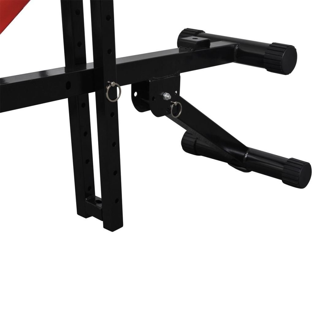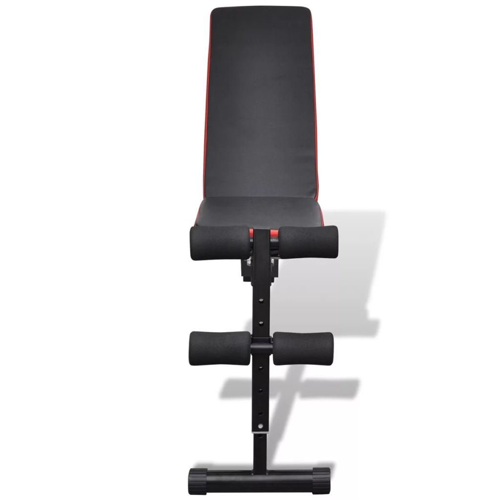 The thick; padded seat is very comfortable; while the heavy duty steel frame makes the bench stable and durable.Color: Black and redFrame material: SteelDimensions: 49.2 x 13.8 x 19.7 inch (L x W x H)Cushion thickness: 1.6 inchNet weight: 26.5 lbMax. user weight: 330.7 lbThe seat cushion has 3 adjustable settingsThe back support plate has 8 adjustable settingsFabric: Polyurethane: 100%