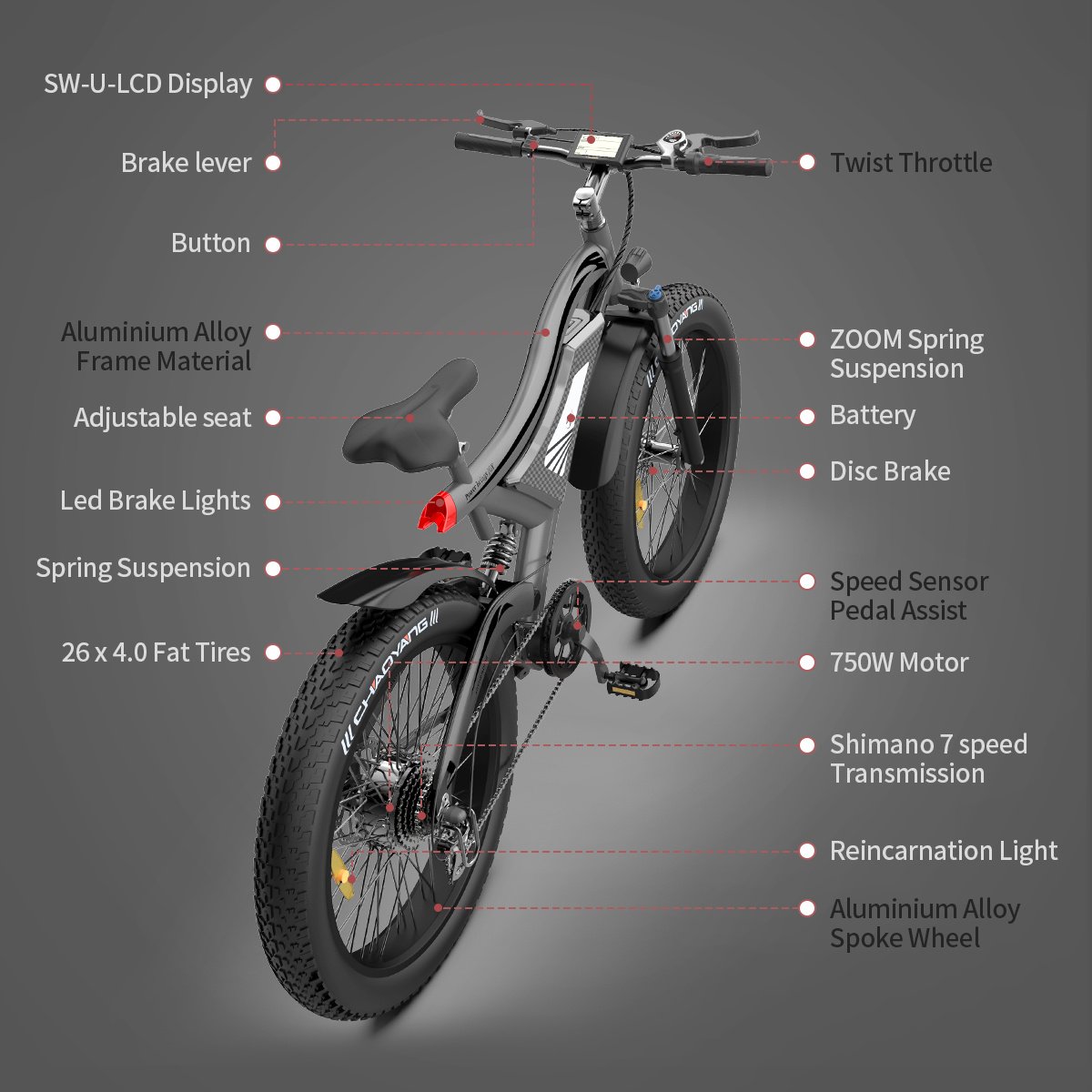 Suitable for people 6' - 6'5We have upgraded the load capacity of the e-bike. Now the bike is suitable for people 6' - 6'5 in height and weighing less than 300 LBS.S18 ConfigurationFrame6061 aluminum alloyMotor750W MotorCharge Time4-6 hoursRange Disdance25-40 kmLightWith front light/tail-lightForkZOOMDerailleurOuter 7 speed SHIMANOBattery48V 15 Ah lithium batteryController48V 22AMax Speed45 km/hBrakeF/R Mechanical brakeDisplaySW-U-LCD displayTire26 x 4.0