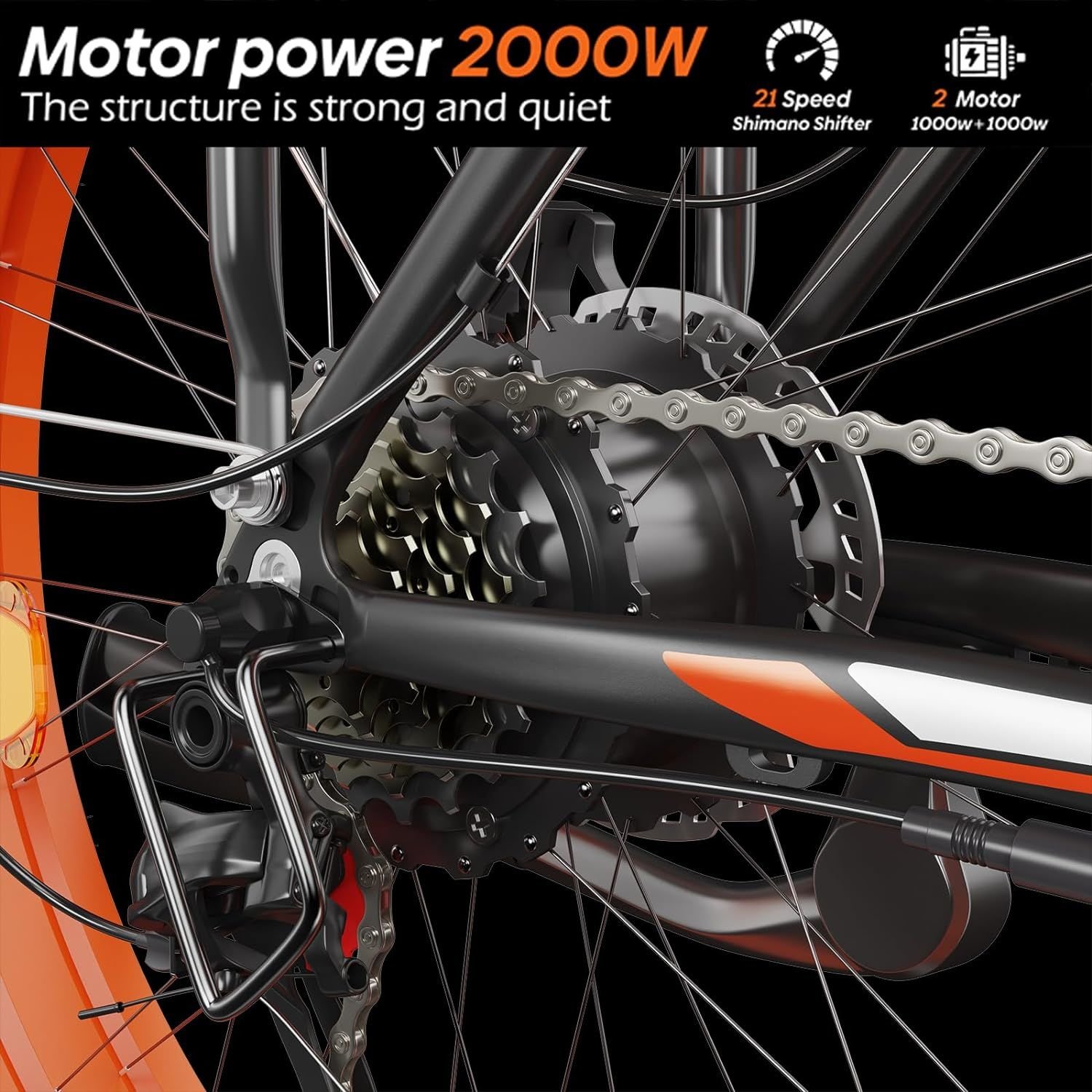 "1. Shimano 21 Speeds2. 48V 2000W Dual Motor3. 26x4.0 Fat Tire4. TX30 Trigger5. LCD Display"
