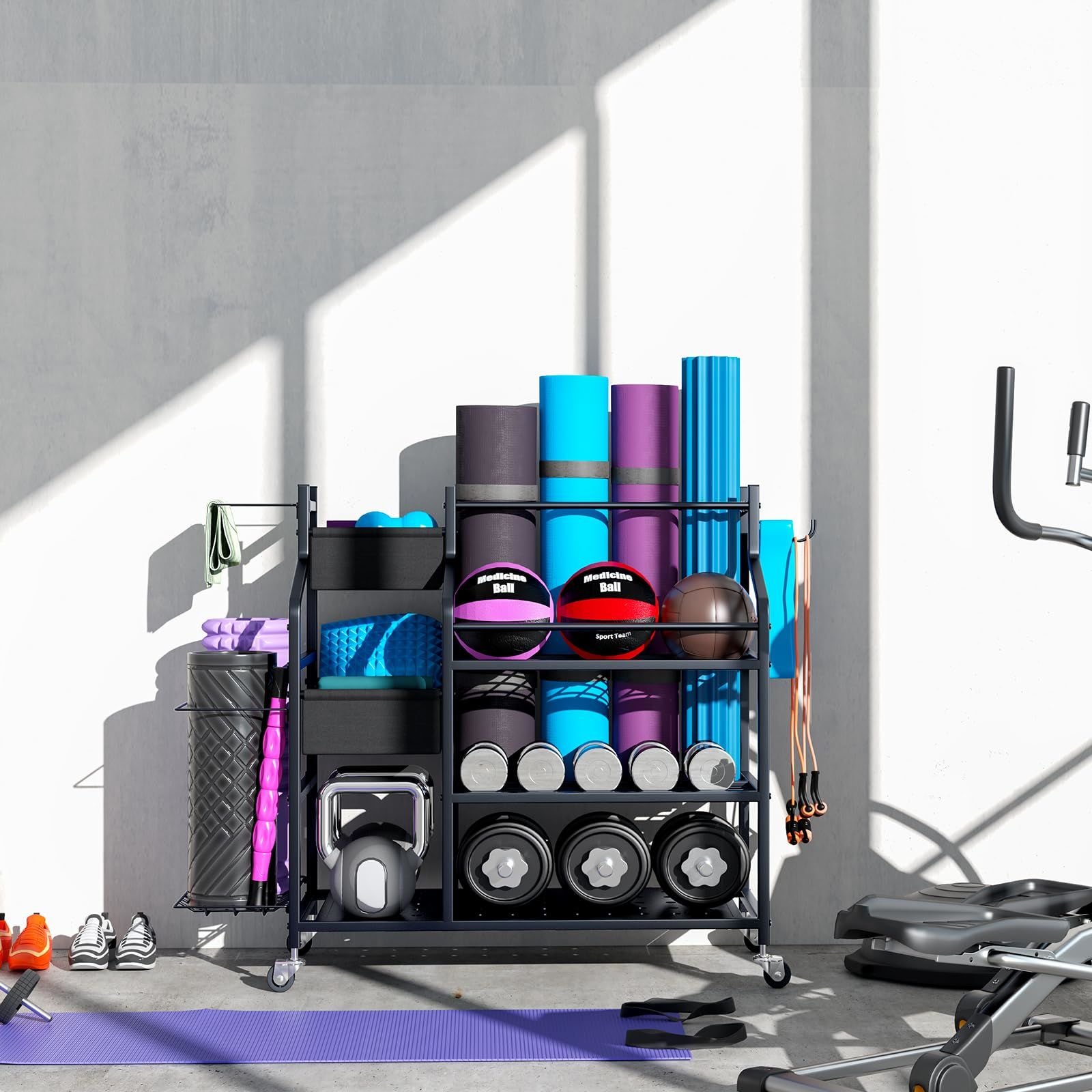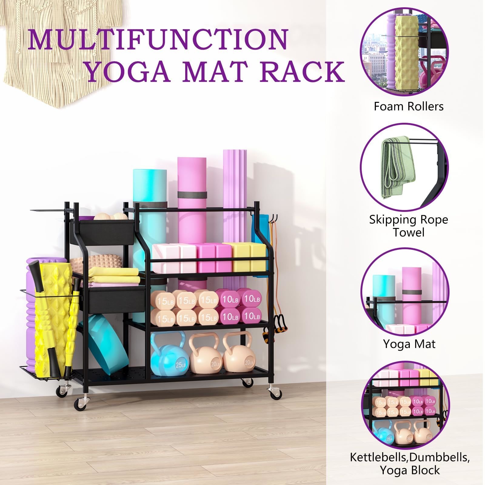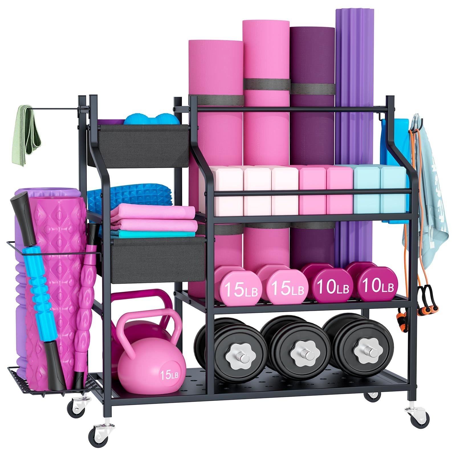 [MUTI-FUNCTIONAL] The shelf of this Gym organizer storage have three tires , each with a different design for a variety of gym equipment. Such as different sizes of yoga mats Dumbbell jump Rope foam roller , Kettlebells, etc.It is suitable for home gym, yoga studio, and gymnasium.