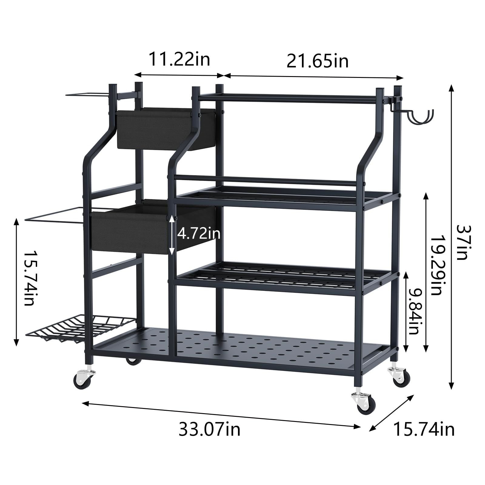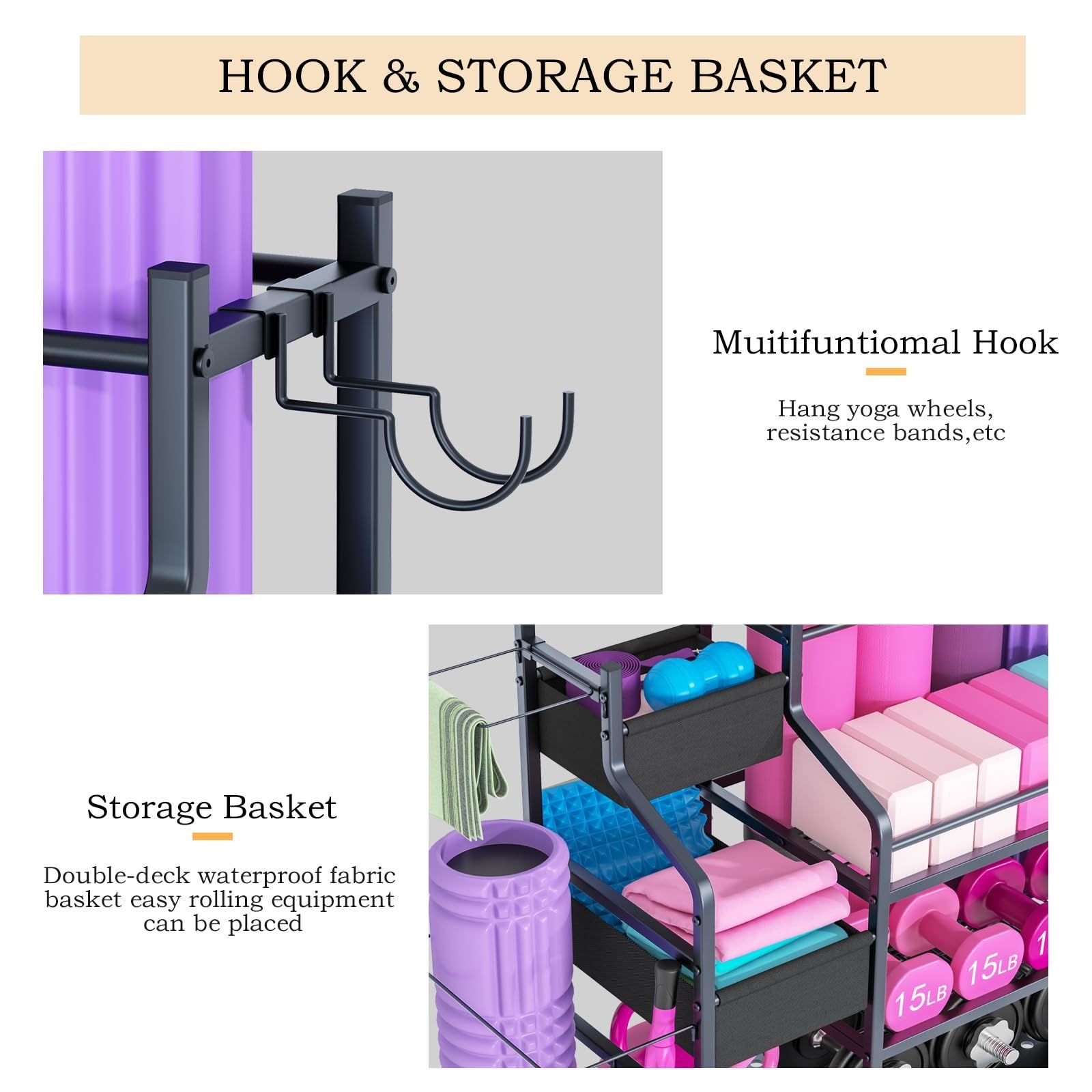 [HOOK & STORAGE BASKET]The workout storage rack cart add two hooks to the side of the storage shelf for easy hanging of the towel, resistance bands,etc. And two waterproof baskets allowing you to place any item. For example, your water bottle, phone, and other personal items. Equipment that is easy to roll can also be placed.