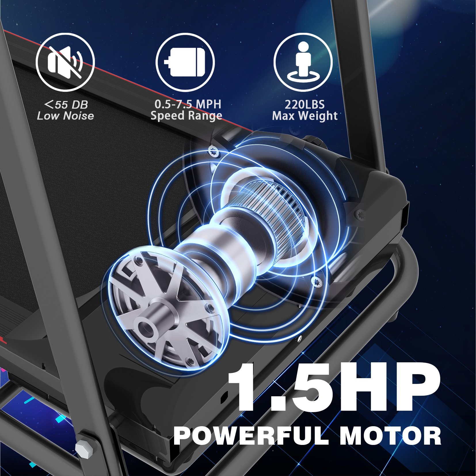 1.ADVANCED FEATURES: This folding treadmill has a weight capacity of up to 250lbs and running speed ranging from 0.5 to 7.5 MPH. 3 Levels incline running machine is equipped with adjustable slope angles.