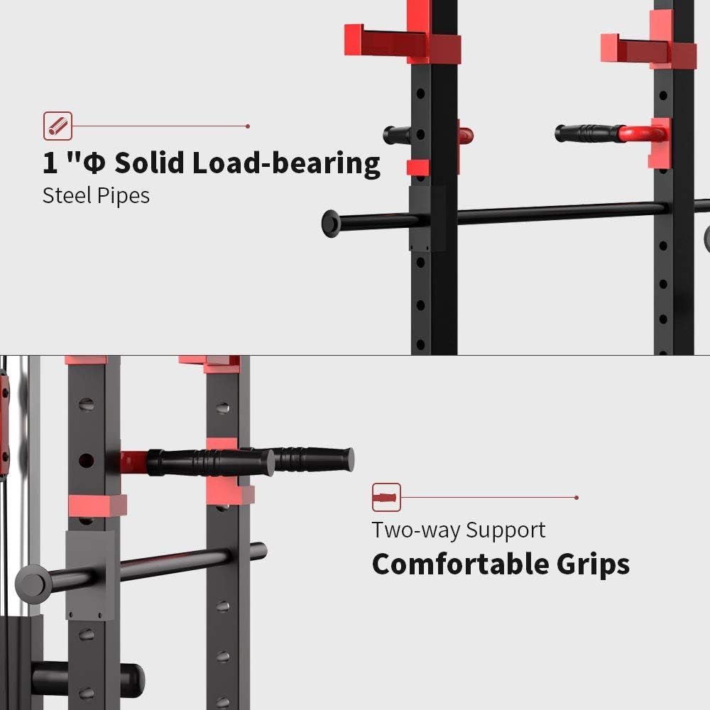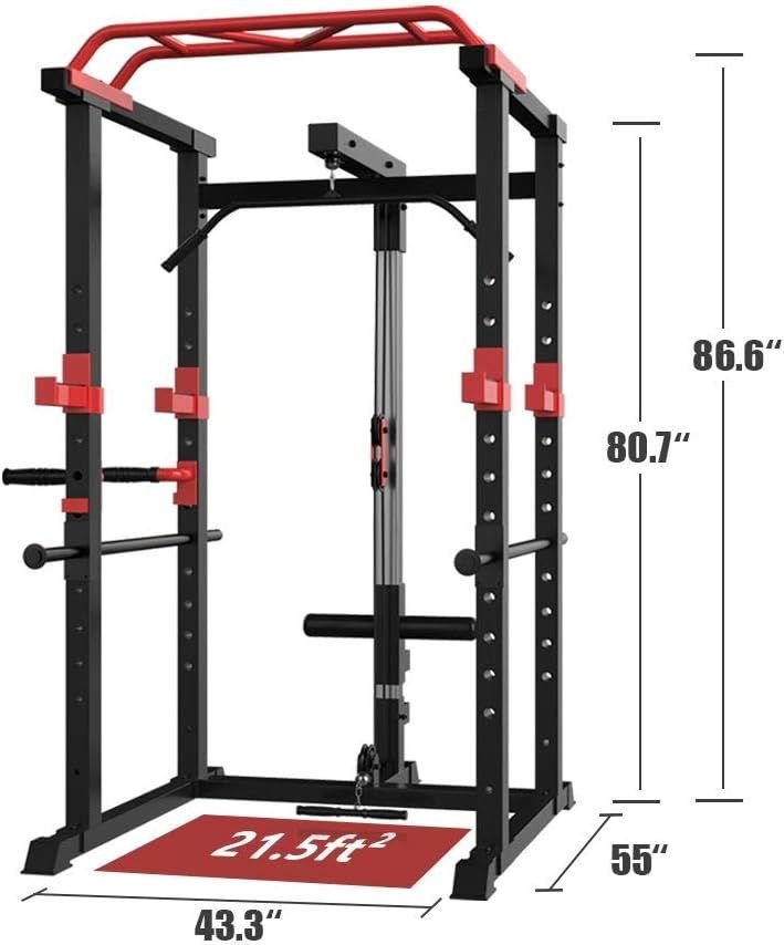 【Steel Frame Structure】The sizes of the assembled power rack cage are 55.1 in(L) x 43.3 in(W) x 86.6 in(H). Inside cage dimension: 41.3" L x 39.7" W. Users can rest assured to use it because of its maximum bearing weight: 50x50mm square steel 1000 lbs, pull-up bars 300 lbs, J-hook 500 lbs, safety bar 800 lbs. All premium steels are painted and pickled, which makes them not easy to rust. The inner space of the power cage is big enough for you to exercise fully without hindrance. 【4 Rubber Foot Support & Stable Reinforcement】The upgraded 4-foot support reinforces the stability of the weight cage power rack and protects the floor from scratches at the same time, not shake during strength training. Our product guarantees your exercise safety. The diameter of the pull-up bar and the two rear bars of the squat rack with lat pull down is suitable for installing the lat pull down on the market, which can unlock more workout actions. 【Adjustable & Compatible Power Cage Home Gym】12 holes for safety bars contain your own customized accessories and ensure all kinds of posture, including squats, shrugs, chin ups/pull ups, incline/decline bench presses, and other strength training exercises. Hole size: 1"" / Space between holes: 3.14"" suitable for the size of the common safety bar on the market. 【800lbs Weight Capacity Safety Bar】The upgraded galvanized safety bar does not peel off paint and scratch the steel uprights; Its insertion and extraction are convenient and flexible, which allows users to change the height of the safety bar at will and exercise more conveniently; The maximum load-bearing of safety bars is 800 lbs. 【Reliable & Clear Instruction】We recommend two people install the weight cage. Please do not lock tightly all the screws when installing the strength training power cages, in case the subsequent components fail to install. Please follow the steps of the instruction in detail. Please contact us with any of your concerns, you will be answered within 12 hours.