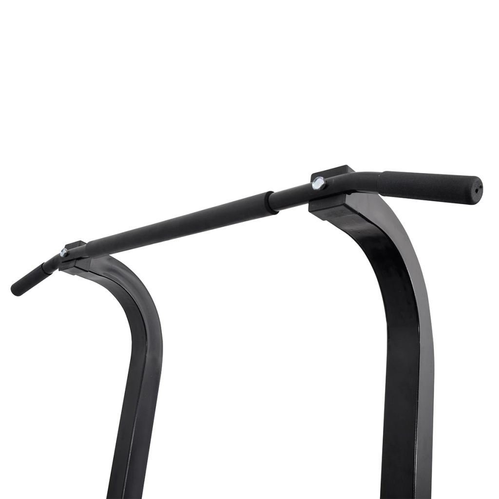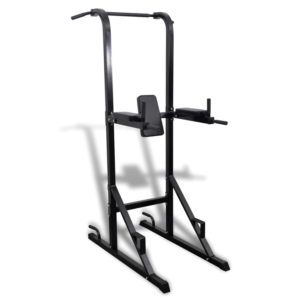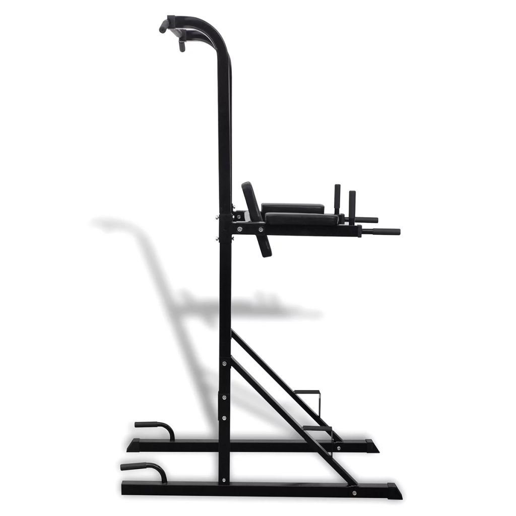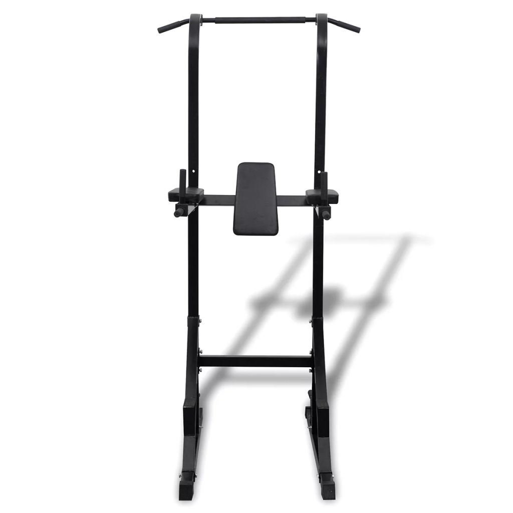 The power tower allows you to do a wide range of exercises to strengthen various muscle groups.Size: 3' 2" x 4' 1" x 6' 9" (L x W x H)Color: Black Material: Power-coated steel + artificial leather cushionMax. weight: 220 lbFeatures:1 x Backrest1 x Chin-up barSturdy baseFabric: Polyurethane: 100%